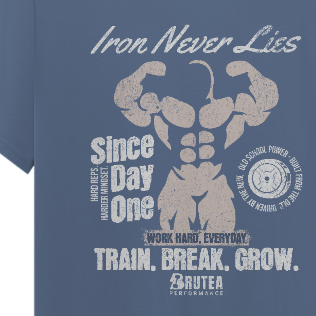 Direta, bruta e com identidade. A “Iron Never Lies” traz uma estampa old school com visual desgastado, reforçando a essência de quem treina pesado desde o primeiro dia.