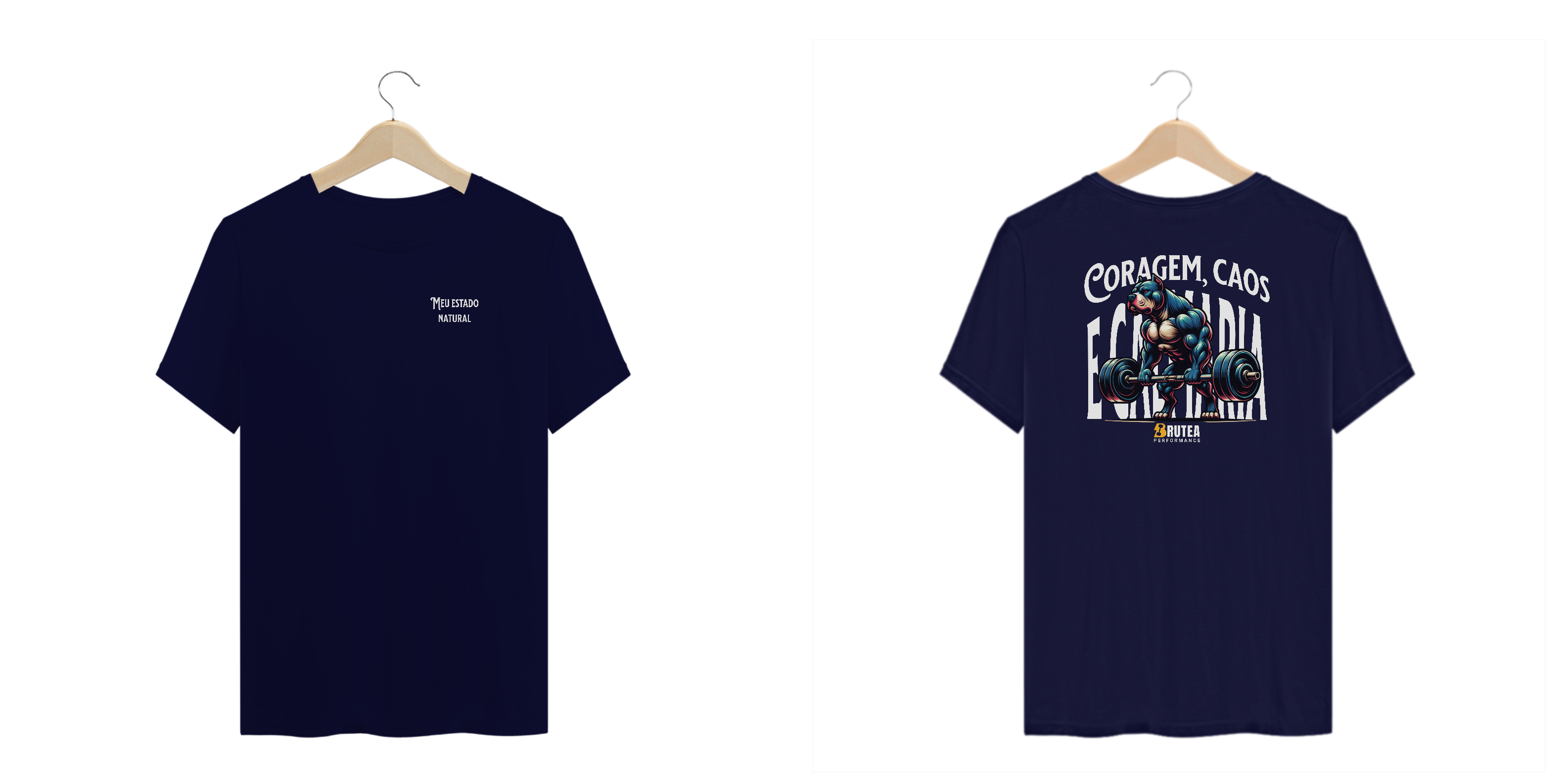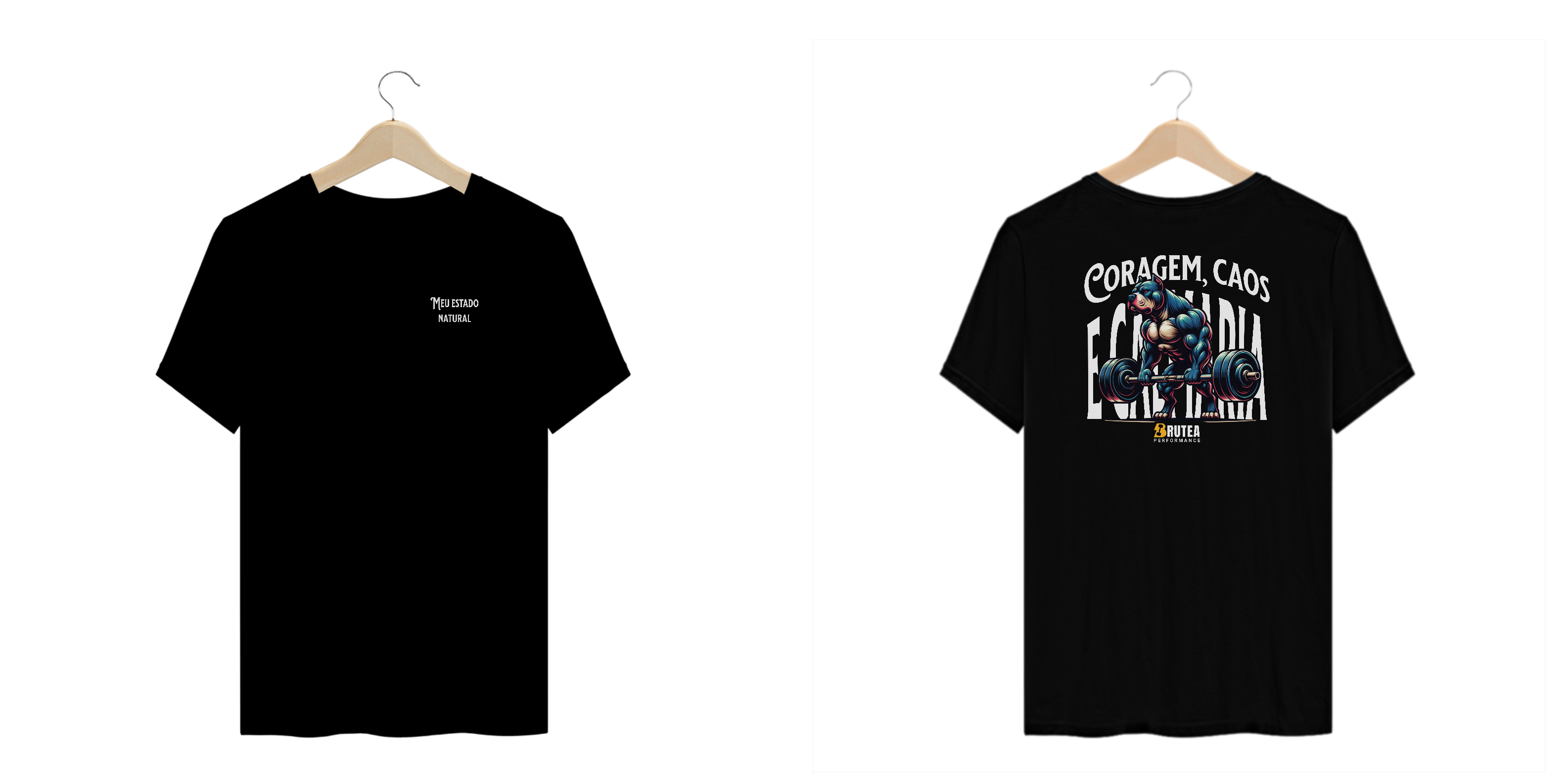 NATURAL CHAOS. Pitbull, barra pesada e a tríade “Coragem, Caos & Calmaria” para lembrar que treino é domínio do próprio instinto. O pocket Meu Estado Natural na frente marca presença; nas costas, arte grandona solta atitude bruta. Para quem levanta peso, encara o dia e domina o caos — tudo no seu ritmo.
